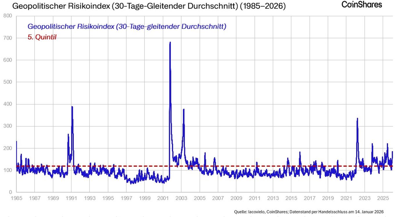 Während das iranische Regime mit zunehmender Repression auf interne Proteste reagiert, verschärfen geopolitische Spannungen weltweit das Risiko strukturell steigender Inflationsraten. Trotz einer momentanen Stabilisierung der US-Preise deuten Anzeichen für eine geldpolitische Kehrtwende der Fed auf eine Schwächung des Dollars hin. In diesem instabilen Umfeld rücken Sachwerte wie Edelmetalle und Bitcoin als krisenfeste Wertaufbewahrungsmittel verstärkt in den Fokus der Anleger. Der aktuelle Marktkommentar von CoinShares’ Senior Portfolio Manager, Marc des Ligneris.