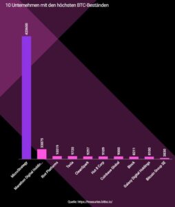 Ein großes Vorbild für die Vorschläge ist dabei MicroStrategy: Das Unternehmen kauft kontinuierlich Bitcoin und nutzt diese als zentrale Reserve in der Firmenbilanz. Die Käufe werden teils durch die Ausgabe von Aktien und Anleihen finanziert. Keine Firma der Welt besitzt aktuell mehr BTCs, als MicroStrategy – es befinden sich 423.650 Bitcoins in Firmenbesitz. Tesla landet bei einem Ranking mit 9.720 Bitcoins auf dem vierten Platz, mit der Bitcoin Group SE befindet sich auch ein deutsches Unternehmen in der Top-10.