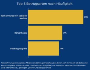 Die häufigste Betrugsmasche sind Fälschungen in sozialen Medien. Kriminelle geben sich hier als bekannte Krypto-Projekte, Influencer oder Unternehmen aus, um Vertrauen zu erschleichen und Anleger gezielt zu täuschen. 34% aller dokumentierten Betrugsfälle entfallen auf diesen Bereich. Auf Platz zwei folgen Börsenhacks mit einem Anteil von 21%, dicht gefolgt von Phishing-Angriffen (19%). Die Täter setzen dabei zunehmend auf psychologische Manipulation und technische Raffinesse, um an private Schlüssel oder Zugangsdaten zu gelangen.