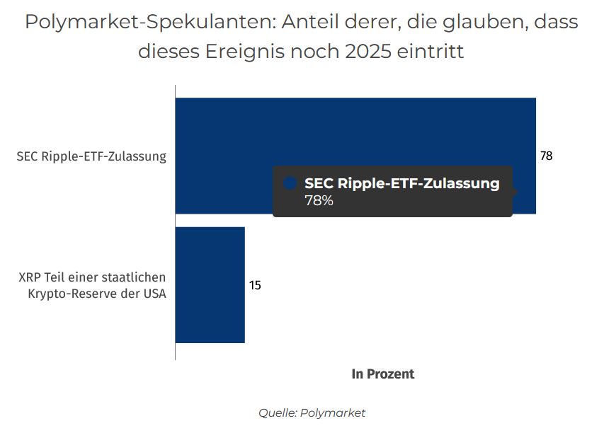 Neben der politischen Dynamik könnte auch der erste XRP-Spot-ETF in Brasilien zum jüngsten Kursanstieg beigetragen haben. Die Genehmigung durch die brasilianische Börsenaufsicht unterstreicht die wachsende institutionelle Nachfrage nach XRP, was den Coin im Vergleich zu Bitcoin und Ethereum besonders stark ansteigen ließ. 78% der Spekulanten auf Polymarket setzen in einer entsprechenden Wette ihr Geld darauf, dass es 2025 auch noch in den USA durch die SEC zu einer Zulassung von XRP-ETFs kommt.