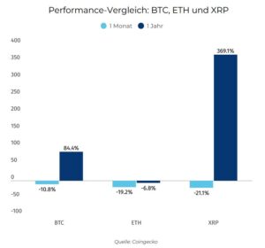 Innerhalb von nur 24 Stunden stieg der XRP-Preis um 5% an. Damit übertrifft das digitale Asset alle anderen Coins mit einer hohen Marktkapitalisierung (Top 30). Innerhalb von 12 Monaten legte Ripple unterdessen um fulminante 369% zu. Zum Vergleich: Bitcoin kommt im selben Zeitraum nur auf ein Plus von 84,4%.
