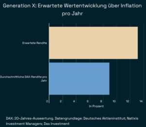 Gleichzeitig überschätzen sie bei Investments auch tatsächlich realistische Renditen auf dem Börsenparkett. 13,1% der Generation X Anleger erwarten eine Wertentwicklung über Inflation von 13,1% p.a. Die durchschnittliche DAX-Performance liegt (20-Jahres-Auswertung) indes lediglich bei 8,9%, auch ein MSCI World kommt im Durchschnitt nicht auf besagte 13,1%.