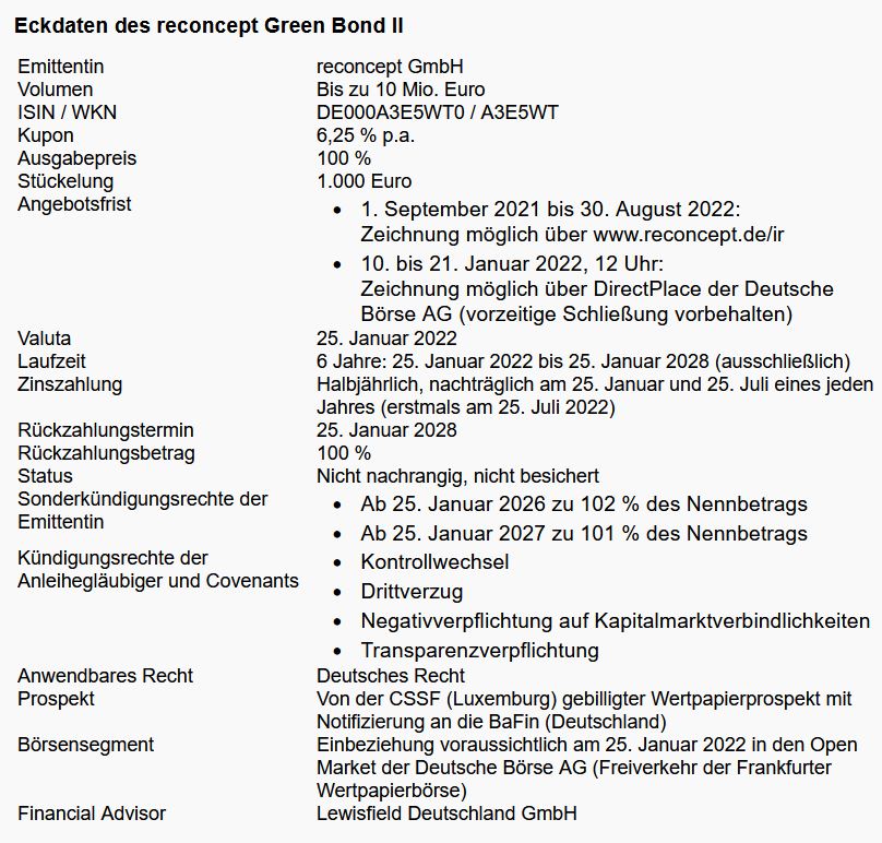 Der Green Bond mit einem Volumen von bis zu 10 Mio. EUR und einer Laufzeit von sechs Jahren vom 25. Januar 2022 bis 25. Januar 2028 kann in der verlängerten exklusiven Frist seit dem 1. September 2021 über www.reconcept.de/ir sowie über ausgewählte Partner gezeichnet werden.