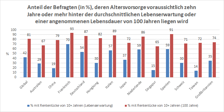 Ermittelt wurde die Zehnjahreslücke durch den Vergleich der Lebenserwartung im jeweiligen Land mit der Erwartung der Befragten, wie lange ihre Altersvorsorge reicht. Weltweit planen 42% um mindestens zehn Jahre zu kurz; in Deutschland sind es sogar mehr als die Hälfte (54%). Mit der weiter steigenden Lebenserwartung wächst diese Herausforderung.