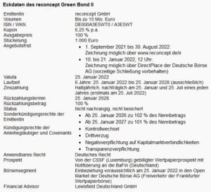 „Unsere Strategie, im 1. Schritt der Zeichnungsmöglichkeit über unsere Partner sowie direkt über unser Unternehmen den Vorzug zu geben, hat sich als absolut richtig erwiesen. Aufgrund der daraus zu erwartenden Vollplatzierung und der anhaltend großen Investorennachfrage haben wir uns nun für eine Aufstockung entschieden – auch, um wie geplant vom 10. bis 21. Januar 2022 eine Zeichnung über die Depotbanken mittels der Zeichnungsfunktionalität „DirectPlace“ der Deutsche Börse AG im Handelssystem XETRA anzubieten“, erklärt Karsten Reetz, geschäftsführender Gesellschafter der reconcept GmbH.
