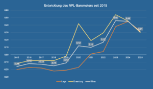 Das Segment der gewerblichen Immobilienkredite sendet die stärksten Stresssignale. Hier ist die NPL-Quote gegenüber dem Vorjahr von 4,8 auf 5,9% gestiegen. Zwei Drittel der befragten Institute berichten von wachsenden NPL-Beständen in diesem Segment, die Hälfte rechnet mit einer weiteren Verschlechterung. Die strukturellen Herausforderungen wie zurückgehende Flächennachfrage bei Büroimmobilien, Transformation im Einzelhandel und höhere Finanzierungskosten belasten sowohl die Kreditperformance als auch die Verwertungsperspektiven.