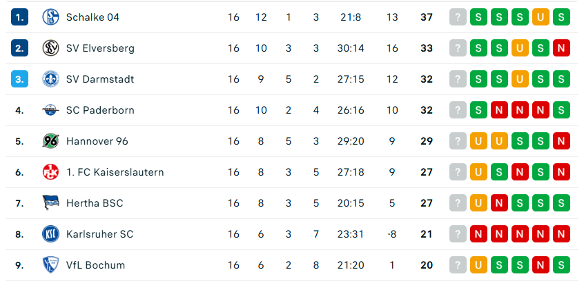 Die Verfolger von Schalke in der 2ten Bundesliga haben allesamt ebenfalls gewonnen, die zweite Reihe spielte Unentschieden. Daher blieb der Vorsprung gleich. Schalke hat am letzten Spieltag der Hinrunde noch eine lösbare Aufgabe gegen den 14ten, nämlich Eintracht Braunschweig – allerdings auswärts. Da dann noch Platz 3 gegen Platz 4 spielt, könnte im optimalen Fall der Vorsprung von Königsblau noch anwachsen.