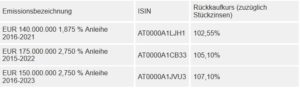 Gleichzeitig hat CA Immo beschlossen, die Inhaber ihrer nachstehend angeführten ausstehenden Schuldverschreibungen einzuladen, der Gesellschaft Angebote zum Rückkauf der ausstehenden Schuldverschreibungen gegen Barzahlung zu unterbreiten.