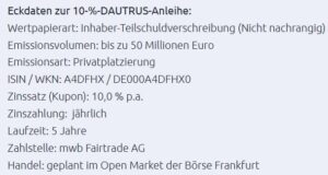 Inzwischen wird die fünfjährige Neuemission auch im Frankfurter Freiverkehrssegment Open Marktet börsengehandelt; der jährliche Fixkupon lautet auf marktüberdurchschnittliche 10,0%.