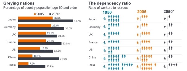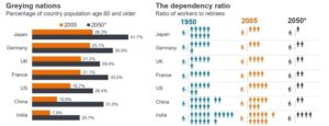 Warum Künstliche Intelligenz (KI) wichtig ist – die demografische Zeitbombe; Quelle: (LHS) Vereinte Nationen, (RHS) OECD-Daten, 2023 (gerundet auf die nächste ganze Person). *Hochrechnung.