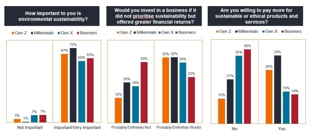 Millennials sind am meisten auf Nachhaltigkeit und Umwelt bedacht, kaufen daher eher nachhaltige oder ethisch vertretbare Produkte und sind bereit, mehr für nachhaltige Marken und Produkte zu bezahlen. So kaufen sie beispielsweise eher ein Elektrofahrzeug. Die Generation Z hat ähnliche Präferenzen. Bei allen vier Generationen wird eingeräumt, dass die Bereitschaft, für nachhaltige Produkte mehr zu bezahlen, vom jeweiligen Produkt oder der jeweiligen Dienstleistung abhängt. Die Baby-Boomer und die Generation X geben jedoch an, dass sie nicht bereit sind, in jedem Fall mehr zu bezahlen.