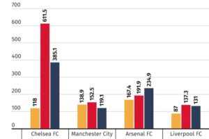 Es folgen Arsenal, Manchester United, Tottenham Hotspur und der FC Liverpool mit einer negativen Transferbilanz von jeweils vielen Hunderten Millionen EUR, wobei ManU mit nur -114,5 Mio. EUR am wenigsten Defizit aufwies unter den Top-6 Clubs.