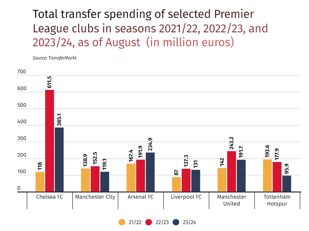 Mit der Verpflichtung des 21-jährigen ecuadorianischen Mittelfeldspielers Moisés Caicedo, der an der Stamford Bridge einen Achtjahresvertrag im Wert von 135 Mio. EUR unterschrieb, brach der FC Chelsea nicht nur den bisherigen Transferrekord der Premier League, sondern übertraf auch die anderen Vereine bei den Gesamtausgaben für Transfers um Längen.