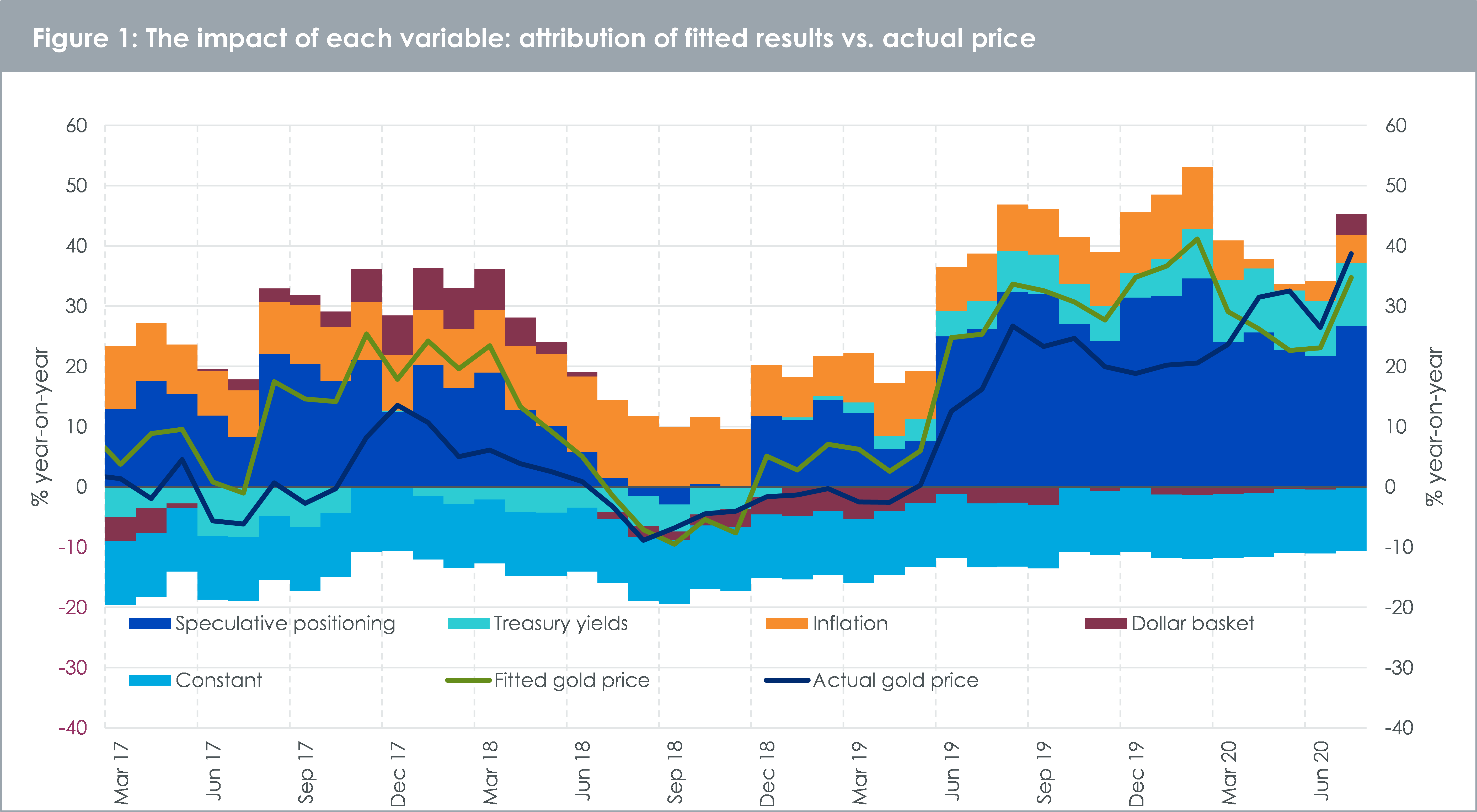 Lassen Sie uns zunächst eine Bestandsaufnahme der Aussagen des Modells zum jüngsten Preisanstieg machen. Mit dem Wissen, wo sich die Renditen für Staatsanleihen, der USD und die spekulative Positionierung im Juli 2020 befanden, zeigt das Modell, dass die Preise im Juli 2020 im Jahresvergleich um 35% gestiegen sein sollten. Tatsächlich stiegen sie im Jahresvergleich um 39%, also nur einen Bruchteil höher.