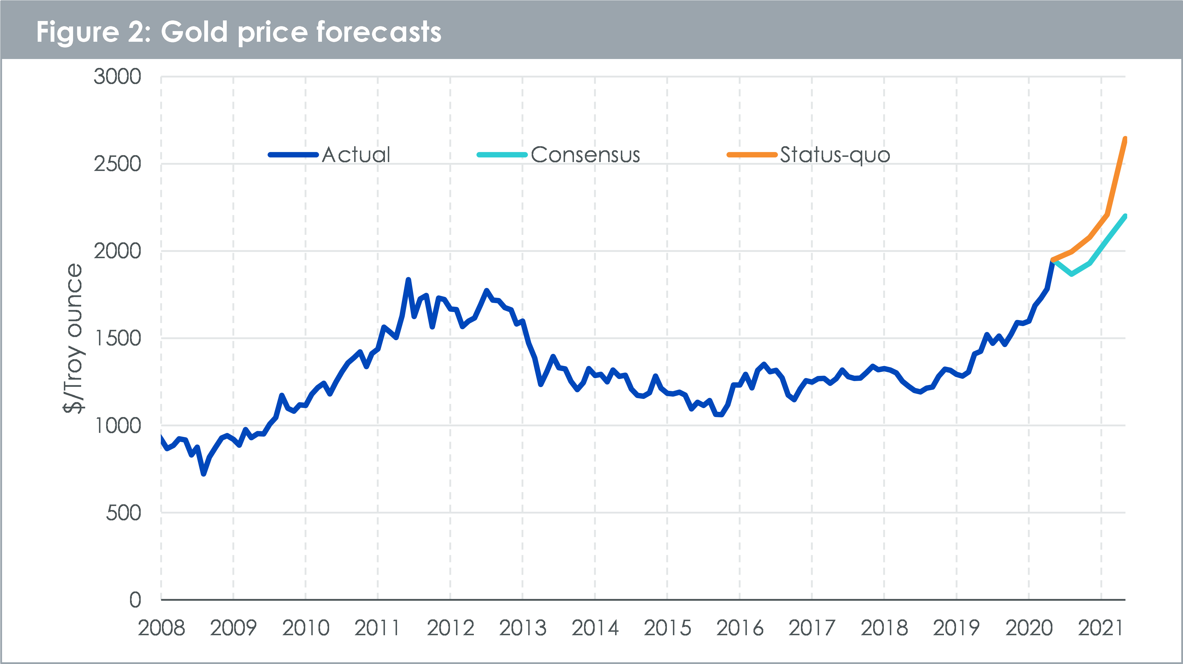 Unser Goldmodell-Framework wird in „Gold: how we value the precious metal“ erklärt. Das Modell generiert eine jährliche prozentuale Wachstumsrate, die wir auf die aktuellen Preise anwenden können, um zu projizieren, in welche Richtung die Goldpreise innerhalb eines Jahres gehen könnten. Jetzt liegt der Goldpreis für Juli 2020 vor und wir können demzufolge den Preis im Juli 2021 prognostizieren. Darüber hinaus können wir Änderungen der wirtschaftlichen Annahmen berücksichtigen, die in diesen turbulenten Zeiten gerechtfertigt sind.