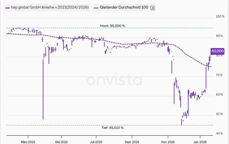 Anleihe 2021/26 ist Mitte Mai fällig. Bei über 80% steht sie doppelt so hoch wie vor Weihnachten, aber deutlich unter pari. Bei Investmentcheck.de wird vor praktisch allen Produkten des hep-Konzerns gewarnt. Konkret sei die Bilanz 2025 durch einen Einmalertrag von 11,6 Mio. EUR ‚aufgehübscht‘, um die gerade einmal drei Monate alte letzte EBIT-Prognose, deren Erreichen jetzt bejubelt wird, ‚am oberen Ende‘ zu erfüllen.