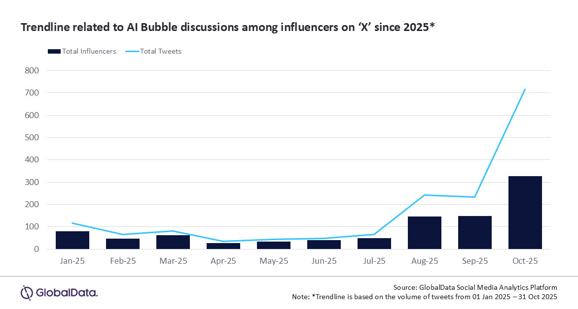Diese dramatische Eskalation wurde durch wachsende Bedenken hinsichtlich der Nachhaltigkeit massiver Investitionen in KI im Vergleich zu deren konkreten Erträgen angeheizt, was die Befürchtungen der Influencer vor einem bevorstehenden Zusammenbruch ähnlich wie bei der Dotcom- oder Immobilienblase unterstreicht, wie die Social-Media-Analyseplattform von GlobalData, einem führenden Daten- und Analyseunternehmen, aufdeckt.
