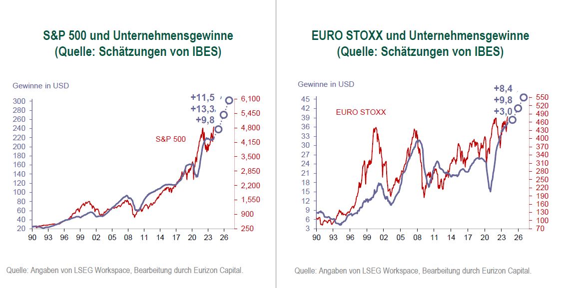 Analystenschätzungen zufolge dürften die Unternehmensgewinne in diesem Jahr, 2025 und auch 2026 im gleichen Tempo steigen wie die Durchschnittswerte vorangegangener Zyklen. Dies sind realistische Annahmen für einen Konjunkturzyklus, der sich nach dem stürmischen Start nach der Corona-Krise endgültig gefestigt hat und nun mit (mäßiger) Marschgeschwindigkeit voranschreiten kann.