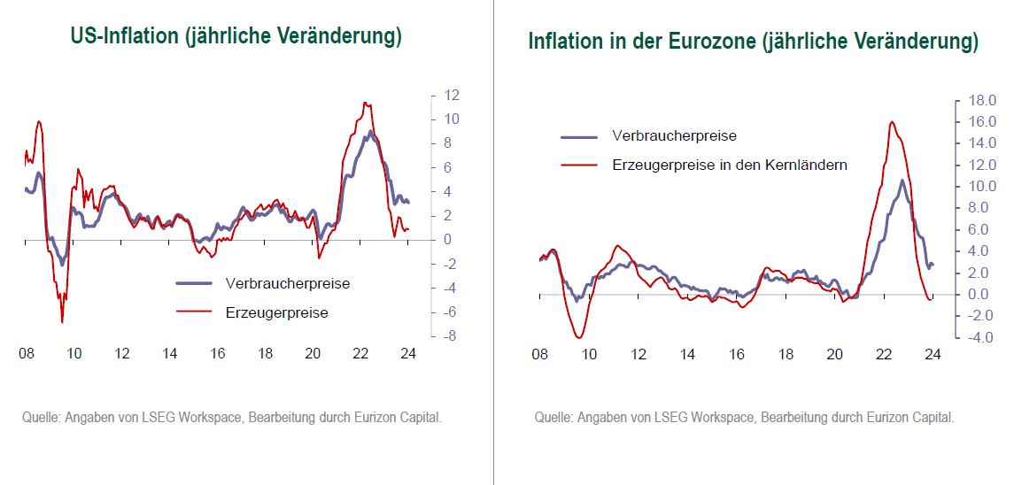 Die Märkte rechneten Ende 2023 damit, dass die Lockerungsphase bereits im März beginnen würde. Jetzt gehen die Geldmarkt-Futures von einer ersten Zinssenkung sowohl bei der EZB als auch bei der FED im Juni aus. Die gegenwärtigen Erwartungen erscheinen realistischer als jene von Ende 2023. In der den Futures zugrundeliegenden aktuellen Prognose liegt das Zinsniveau der Fed FED 3,0 bis 3,5% und das der EZB bei 2,0 bis 2,5%. In beiden Fällen liegt dies 200 BP unter dem aktuellen Niveau, aber deutlich unter den Tiefstständen des letzten Zyklus. Diese Prognosen sind vereinbar mit dem Ende des Inflationsschocks und der Fortsetzung des Konjunkturzyklus – die optimale Kombination für das mittelfristige Szenario. […]