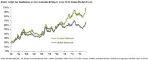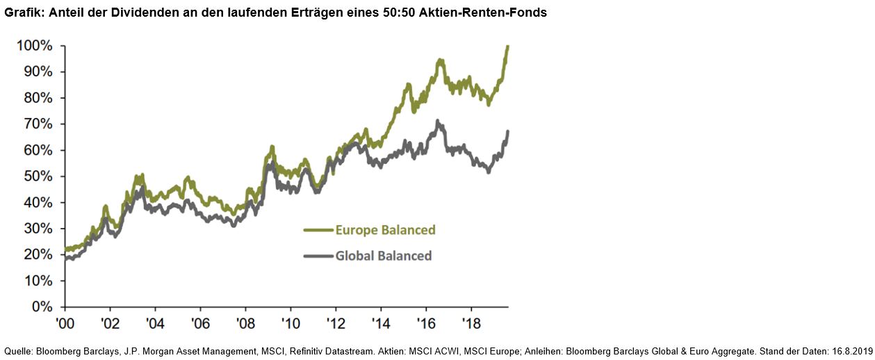 Durch die Niedrigzinspolitik habe sich diese Situation jedoch grundlegend verändert. Inzwischen führt die traditionelle Risikodiversifikation zu erheblichen Ertragseinbußen im Gesamtportfolio: Euro-Anleihen mit hoher Bonität, repräsentiert im Bloomberg Barclays Euro Aggregate Index, haben im August zum ersten Mal in der Historie ein negatives Renditeniveau erreicht. Die laufenden Erträge in einem klassischen europäischen Mischportfolio aus 50% Aktien und 50% Renten kommen inzwischen zu fast 100% von der Aktienseite.