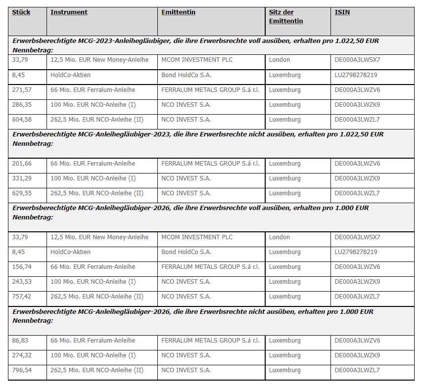 Es besteht grundsätzlich kein Wahlrecht für die Anleihegläubiger hinsichtlich des Umtauschverhältnisses der Umtausch-Anleihen untereinander, sondern die Zuteilung erfolgt gemäß dem in den Anleihegläubigerversammlungen beschlossenen Zuteilungsschlüssel abhängig davon, ob die Anleihegläubiger ihre Erwerbsrechte auf die New Money-Schuldverschreibungen und die HoldCo-Aktien ausüben oder nicht, und welche Bestehenden MCG-Schuldverschreibungen (2026 vs. 2023) sie halten.