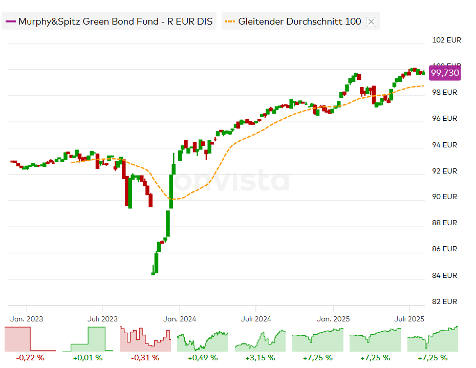 Ausschlusskriterien seien beispielsweise Atom, Waffen und Gas. Der Fonds muss mindestens 80% seines Wertes entsprechend seiner nachhaltigen Anlagestrategie und mindestens 51% in Green Bonds investieren.