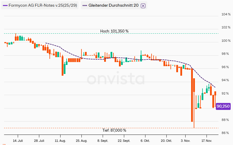 Als Beispiel mag Formycon genannt werden: Die im Juli begebene Anleihe hat seit Ende Juli kein pari-Niveau mehr erreicht und notiert aktuell bei rund 92,5%. Das zeigt, dass der Markt zwar grundsätzlich funktioniert, aber das bei der gewählten Struktur der Floating-Rate-Notes die Bäume auch nicht in den Himmel wachsen. Das liegt nicht zwingend an den Emittenten, sondern in der Natur des variablen Zinssatzes.