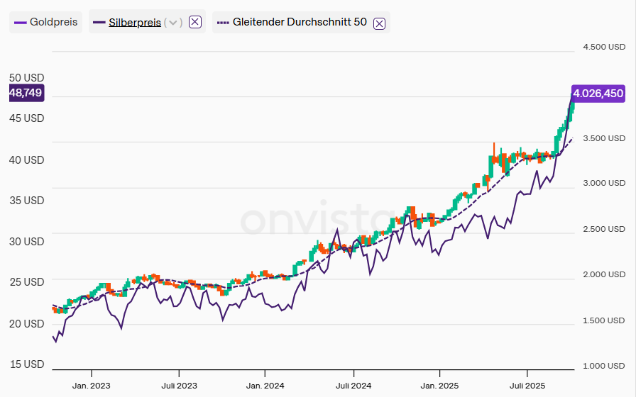 Die derzeitige Entwicklung des Silberpreises deutet dabei auf eine langfristige Trendwende hin. Zum ersten Mal seit 14 Jahren schaffte der Silberpreis Ende August die Marke von 40 USD pro Unzel. Nur wenige Wochen später, Anfang Oktober, lag er bereits bei 47,51 USD. Dieser Anstieg wird durch mehrere Faktoren begünstigt: Zum einen endet die Zinssenkungspause der US-Notenbank, was typischerweise Edelmetalle beflügelt. Zum anderen wächst die industrielle Nachfrage nach Silber – insbesondere in der Solar- und Halbleiterindustrie, wo Silber als Schlüsselmetall gilt.