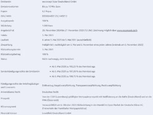 Solarenergie setzt sich allmählich in der Gunst von der Windenergie ab – das ergaben viele Gespräche von BondGuide mit Experten. Die aktuellen Umsetzungsmodalitäten in Deutschland sind ebenfalls nach Expertenmeinung ausnahmsweise in Deutschland innerhalb Europas am vorteilhaftesten. Wie wir aus der Vergangenheit wissen, kann sich alles in jedwedem Land auch schnell ändern. Ein Solarpark dauert insgesamt immer noch 2-3 Jahre, aber ein Windpark eher 7. Daher ist klar, was sich mittelfristig durchsetzen dürfte. Dafür sind die Hamburger optimal aufgestellt. Die Zeichnungsfrist läuft wieder im Tröpfchenmodus über maximal ein Jahr. Dass die Notierungsaufnahme der neuen Anleihe erst in Q4-2025 vorgesehen ist, mag ein Detail-Malus sein.