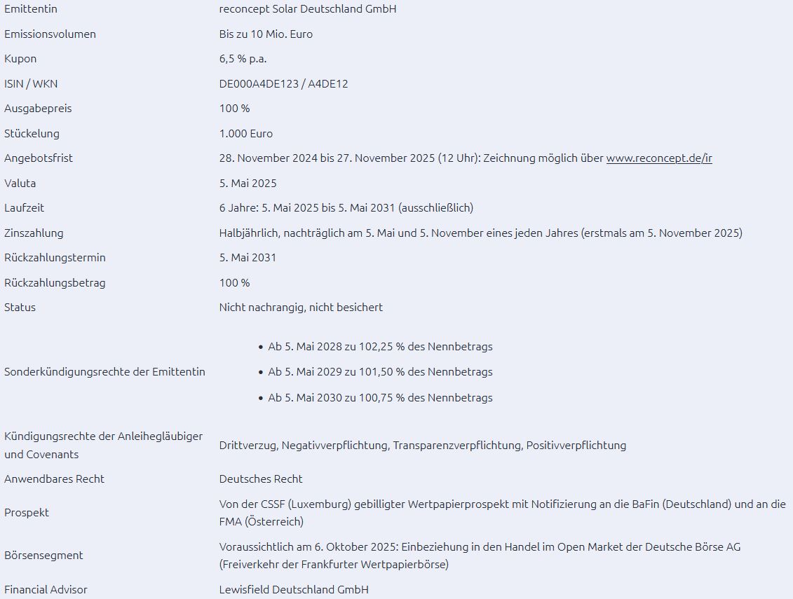 Der Solar Bond Deutschland III (DE000 A4DE12 3) im Volumen von erneut bis zu 10 Mio. EUR bietet über die Laufzeit von sechs Jahren einen Zinssatz von 6,5% p.a. (SBD II: 6,75%). Die Zinszahlung erfolgt auch halbjährlich. Die Platzierung läuft wie gewohnt als Eigenemission über den Webauftritt der Hamburger. Eine Notierungsaufnahme ist Ende nächsten Jahres vorgesehen, am 6. Oktober 2025.