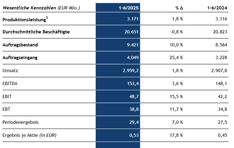 Demnach rechnet der Vorstand für das Gesamtjahr weiterhin mit einer moderaten Leistungs- und Umsatzsteigerung sowie mit einer EBIT-Marge von 2,8 bis 3,0%. Das Ziel bis 2030 sei eine EBIT-Marge von 3,5 bis 4,0%.