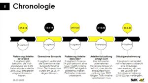 Die Emittentin geht davon aus, dass im Falle von Käufen bzw. Verkäufen über die Börse nach dem 29. März 2023 auch weiterhin Stückzinsen berechnen würden. Es könne allerdings nicht ausgeschlossen werden, dass bis zur technischen Umsetzung der Beschlüsse der Anleihegläubigerversammlung vom 29. März (voraussichtlich bis Ende April 2023) Stückzinsen in Höhe von 8,5% p.a. statt 10,25% p.a. berechnet würden bzw. die Kapitalisierung der Zinsen zum 29. März ggf. noch nicht berücksichtigt sei.