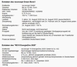 Neu aufgelegt hat reconcept außerdem eine inflationsgeschützte Nachranganleihe „RE15 EnergieZins 2025“. Die neue Vermögensanlage ist mit 4,0% p.a. über rund fünf Jahre bis Ende Dezember 2025 verzinst. Zusätzlich erhöht sich der Zinsanspruch jährlich um die jeweilige Inflationsrate.