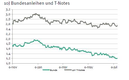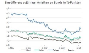 Die Marktakteure nehmen die Probleme der Banco Espirito Santo zusehends gelassener hin. Die Aussagen der portugiesischen Notenbank haben wohl dazu beigetragen, dass man nun nicht mehr von einer neuen Banken- oder gar Schuldenkrise im Euroraum ausgeht. Alle Beteiligten haben sich darum bemüht, deutlich zu machen, welche Möglichkeiten es zur Vermeidung ernstzunehmender Konsequenzen aus diesem Fall gibt. Nichtsdestotrotz ist die Schuldenkrise im Euroraum längst nicht ausgestanden. Nicht zuletzt haben die jüngsten Daten zur Industrieproduktion die Sorge vor einem schnellen Ende des ohnehin schwachen Aufschwungs im Euroraum geschürt. Der IWF schlägt in dieselbe Kerbe: Mit Veröffentlichung der sogenannten Level IV Konsultationen zum Euroraum senkte er die Wachstumsprognose für das laufende Jahr um 0,1%-Punkte auf 1,1%. Zugleich ermahnte er Euroland, mit dem Reformkurs (zu mehr Wettbewerbsfähigkeit) und dem Abbau struktureller Hemmnisse fortzufahren. Es besteht dementsprechend tatsächlich das Risiko, dass die Wachstumsdynamik bald wieder nachlassen könnte. In Anbetracht der Verschuldungsquote der europäischen Länder wäre das sicher sehr problematisch. Diese Aussagen sollten einige Regierungen (insbesondere Frankreich und Italien) hoffentlich nachdenklich stimmen. Die Tendenzen dort sind ja bekanntlich andere.