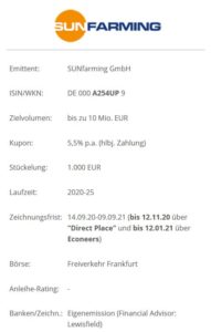 Die SUNfarming GmbH geht mit ihrer neuen Unternehmensanleihe über bis zu 10 Mio. EUR an den Start: Interessierte Anleger kommen u.a. ab heute über die Börse Frankfurt zum Zug. Die Zeichnung ist bis 12. November angesetzt, kann aber vorzeitig geschlossen werden. Im Anschluss ist die Notierungsaufnahme im Freiverkehrshandel Open Market der Deutsche Börse AG geplant.