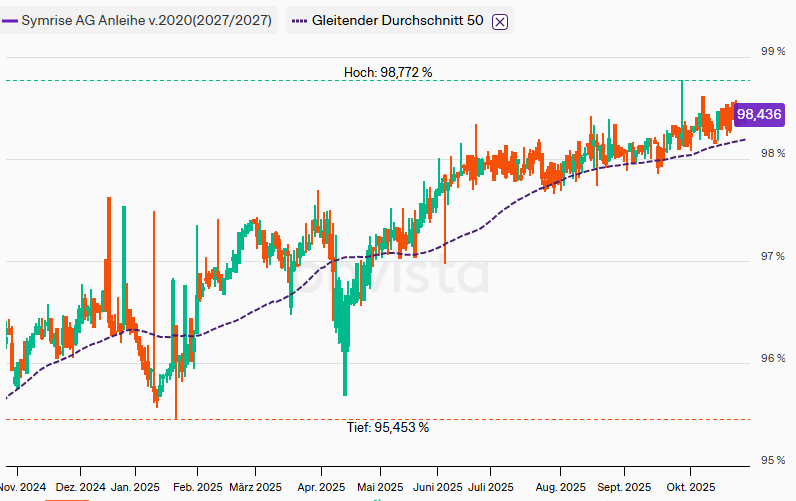 Im September hat Symrise erstmalig eine Anleihe mit einem Instrumentenrating in Höhe von 800 Mio. EUR, einer Laufzeit von 7 Jahren und einem Kupon von 3,25% erfolgreich begeben. Die Erlöse würden im Wesentlichen für die vorzeitige Refinanzierung von Fälligkeiten verwendet.