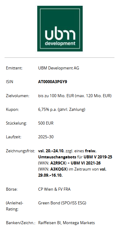 Der UBM Green Bond 2025 wurde in Österreich, Deutschland und Luxemburg im Rahmen eines öffentlichen, prospektpflichtigen Angebots und in weiteren Staaten im Rahmen einer Privatplatzierung zur Zeichnung angeboten. Geplanter Valutatag ist der 30. Oktober.