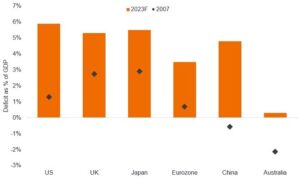 Die US-Regierung ist auf dem besten Weg, 2023 mehr Kredite aufzunehmen als 2022. Nach den jüngsten Prognosen wird das US-Defizit im Jahr 2023 ca. 5,8% des BIP erreichen (7%, wenn man die Verringerung der Ausgaben im Zusammenhang mit der Rücknahme des Erlasses von Studentendarlehen nicht berücksichtigt). Für eine Wirtschaft mit Vollbeschäftigung ist dies eine rücksichtslose Haushaltsausgabe und trägt zum Angebotsanstieg bei den Staatsanleihen bei. Die USA sind jedoch bei weitem nicht allein. […]