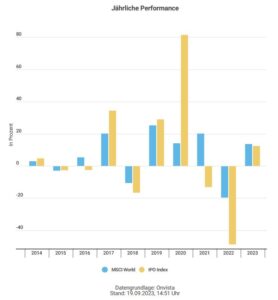 Der MSCI World Index, der rund 1.600 Unternehmen aus 23 Industrieländern abbildet, entwickelte sich zuletzt deutlich besser, als der FTSE Renaissance Global IPO Index. Dieser wiederum bildet die Wertentwicklung von Aktien ab, die erst seit kurzem gelistet sind. Während ersteres auf Jahressicht beispielsweise knapp 15% zulegte, steht beim IPO-Index ein Minus von 0,19%.