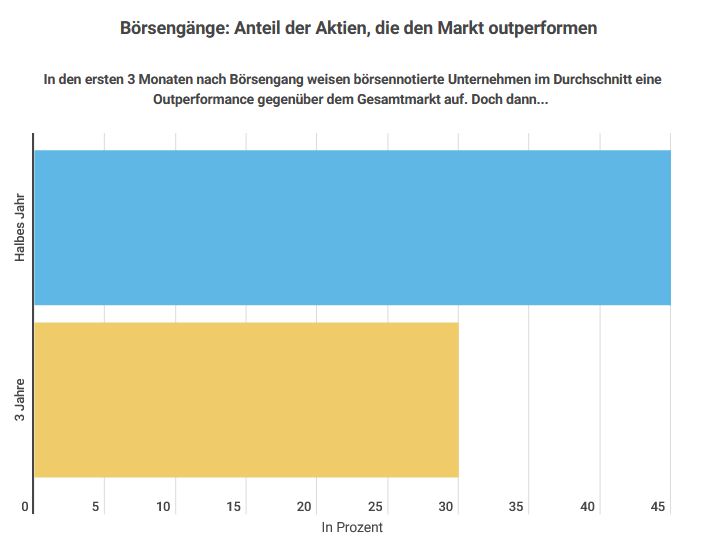 Am Tag des Börsengangs weisen beim Untersuchungszeitraum 74% der Aktien eine positive Rendite auf. Im ersten halben Jahr steht indes nunmehr bei 45% eine Outperformance gegenüber dem Gesamtmarkt, nach drei Jahren sinkt der Anteil sogar auf 30%. Soll heißen: Deutlich häufiger hat es sich ausgezahlt, zu einem geringeren Risiko in den Gesamtmarkt zu investieren, beispielsweise mittels eines ETFs, anstatt auf Börsenneulinge zu setzen.