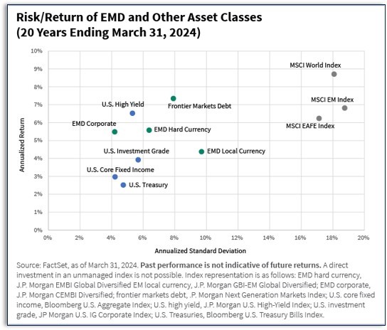 Wir sind der Meinung, dass die Anleger langfristig besser für das Eingehen von Kreditrisiken als für das Eingehen von Währungsrisiken im Bereich der Schwellenländeranleihen entschädigt werden. Dies gilt insbesondere für Staatsanleihen in Hartwährung, die in der Vergangenheit geringe Kreditausfälle und hohe Erholungswerte aufwiesen. Das Schaubild veranschaulicht das attraktive Risiko-/Ertragsprofil von EMD-Hartwährungsanleihen (einschließlich der bemerkenswerten historischen Performance von Frontier Markets-Anleihen).
