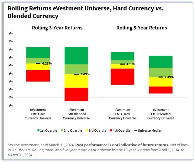 Die andere Grafik zeigt, dass Manager mit einem Hartwährungsansatz mittelfristig besser abgeschnitten haben als Manager mit einem gemischten Ansatz (rollierende Drei- und Fünfjahreszeiträume bis zum 31. März 2024). Über den rollierenden Fünfjahreszeitraum bis zum 31.3.24 beträgt die mittlere Rendite für das eVestment-Hartwährungsuniversum 4,13% gegenüber 2,49% für den gemischten Ansatz. Über den rollierenden Dreijahreszeitraum liegt der Median der Rendite für das eVestment-Hartwährungsuniversum bei 4,23% gegenüber 2,89% für das gemischte Universum.